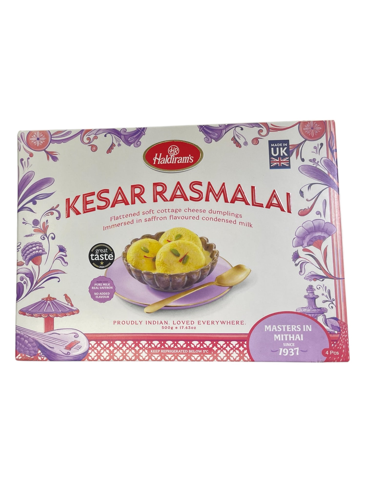 Haldiram’s Kesar Rasmalai complements its cultural significance as a ready to eat indian desert, featuring soft, spongy chenna (cottage cheese) dumplings soaked in sweetened, saffron-infused creamy milk. Rasmalai originated from the eastern regions of India (Bengal/Odisha) as an evolution of the Rasgulla. It holds deep cultural significance as a symbol of joy and celebration at festivals like Diwali and weddings.