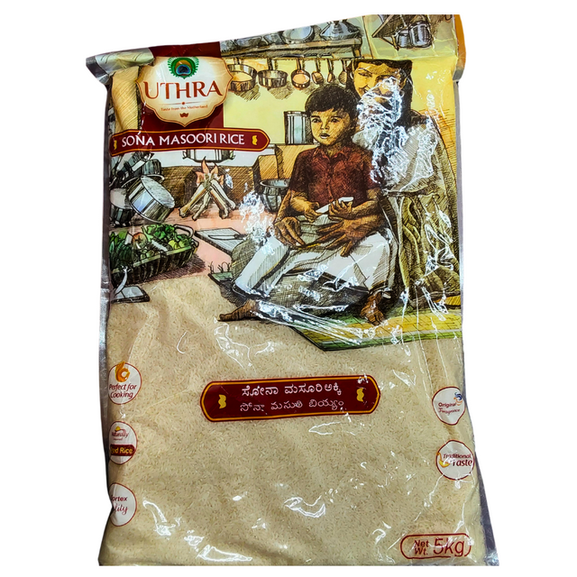 Uthra Sona Masoori Rice is a popular medium-grain variety known for its fluffy texture and delicate aroma. Perfect for everyday meals, this 5kg pack offers excellent value for your kitchen. It's a versatile choice that cooks beautifully, absorbing flavours well.